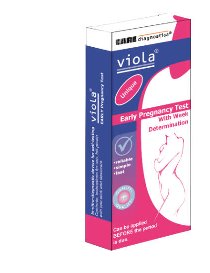 viola stands for clinically proven pregnancy tests, which determine a pregnancy from a concentration of the hormone hCG of more than 12 lU/L (Early Pregnancy Test) or 25 lU/L (Pregnancy Test). The unique test design guarantees simple, reliable and hygienic use.